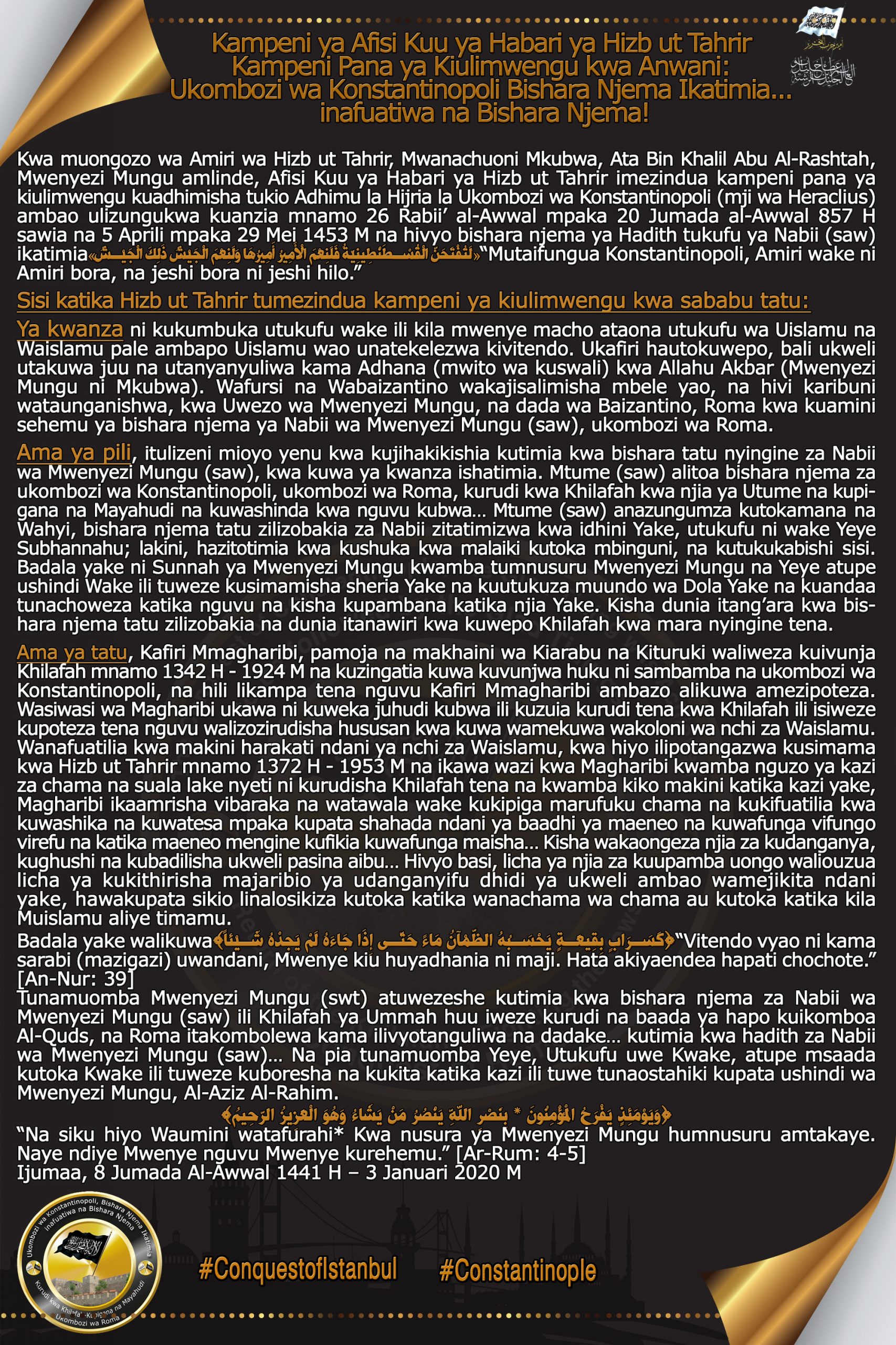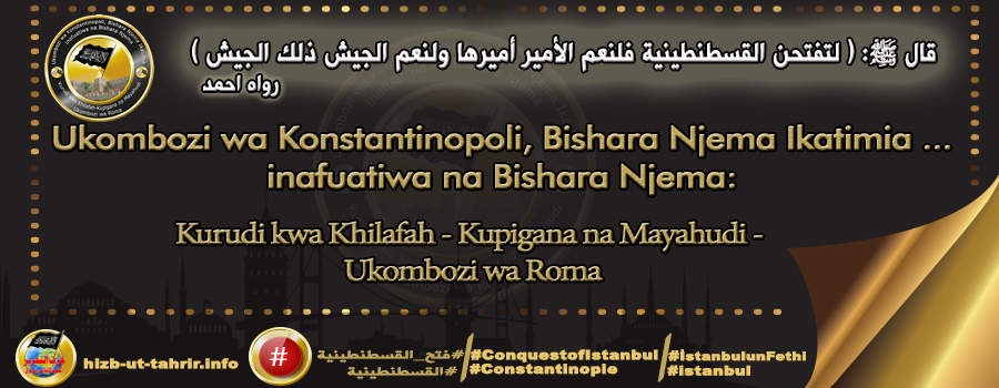 Kwa muongozo wa Amiri wa Hizb ut Tahrir, Mwanachuoni Mkubwa, Ata Bin Khalil Abu Al-Rashtah, Mwenyezi Mungu amlinde, Afisi Kuu ya Habari ya Hizb ut Tahrir imezindua kampeni pana ya kiulimwengu kuadhimisha tukio Adhimu la Hijria la Ukombozi wa Konstantinopoli (mji wa Heraclius) ambao ulizungukwa kuanzia mnamo 26 Rabii’ al-Awwal mpaka 20 Jumada al-Awwal 857 H sawia na 5 Aprili mpaka 29 Mei 1453 M na hivyo bishara njema ya Hadith tukufu ya Nabii (saw) ikatimia«لَتُفْتَحَنَّ الْقُسْطَنْطِينِيَّةُ فَلَنِعْمَ الْأَمِيرُ أَمِيرُهَا وَلَنِعْمَ الْجَيْشُ ذَلِكَ الْجَيْشُ»“Mutaifungua Konstantinopoli, Amiri wake ni Amiri bora, na jeshi bora ni jeshi hilo.”